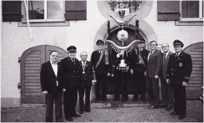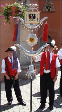 Direkt darunter befindet sich beim Schellenbaum der Stadtkapelle Bopfingen eine kleine Standarte mit dem Stadtwappen,